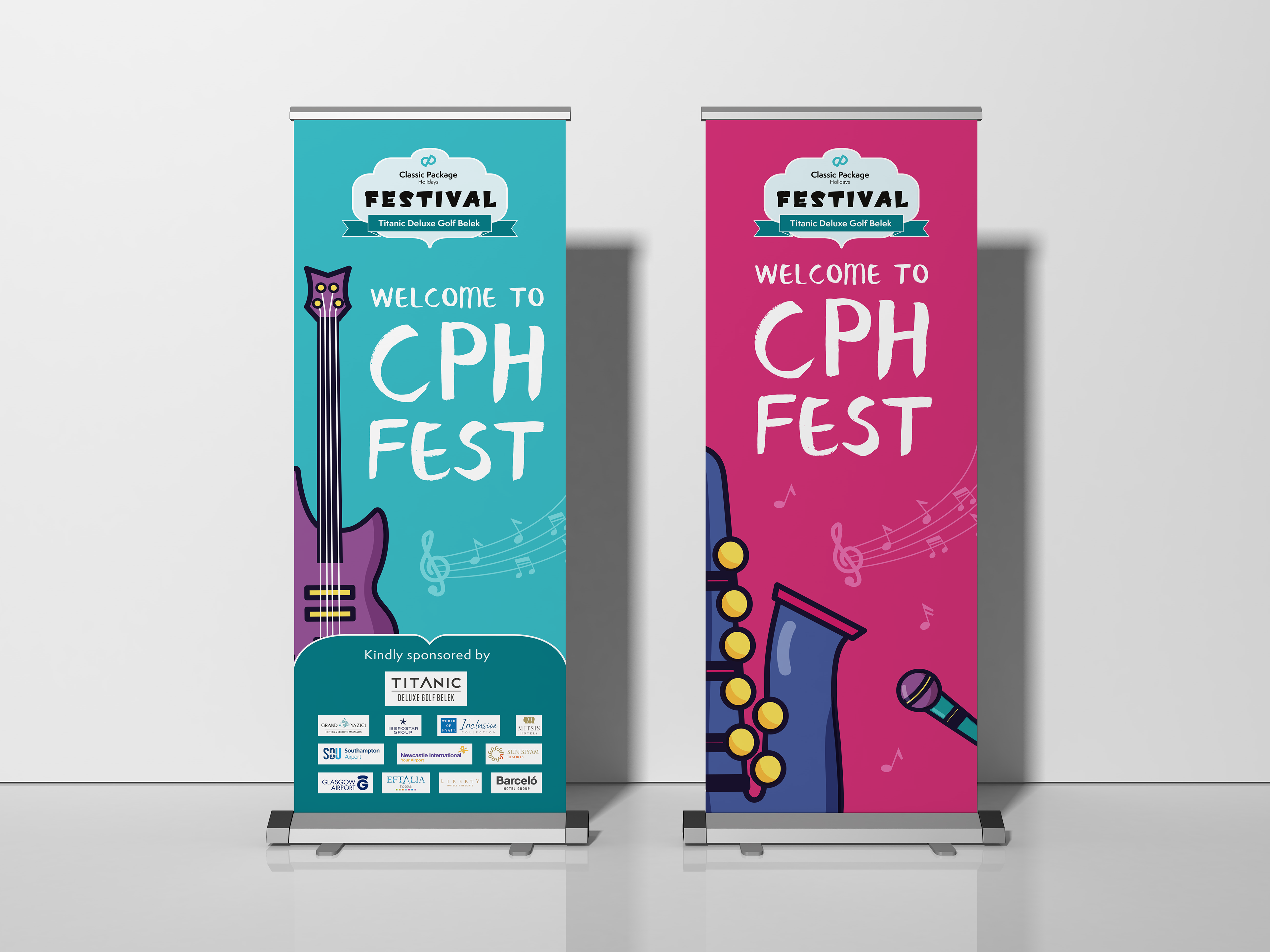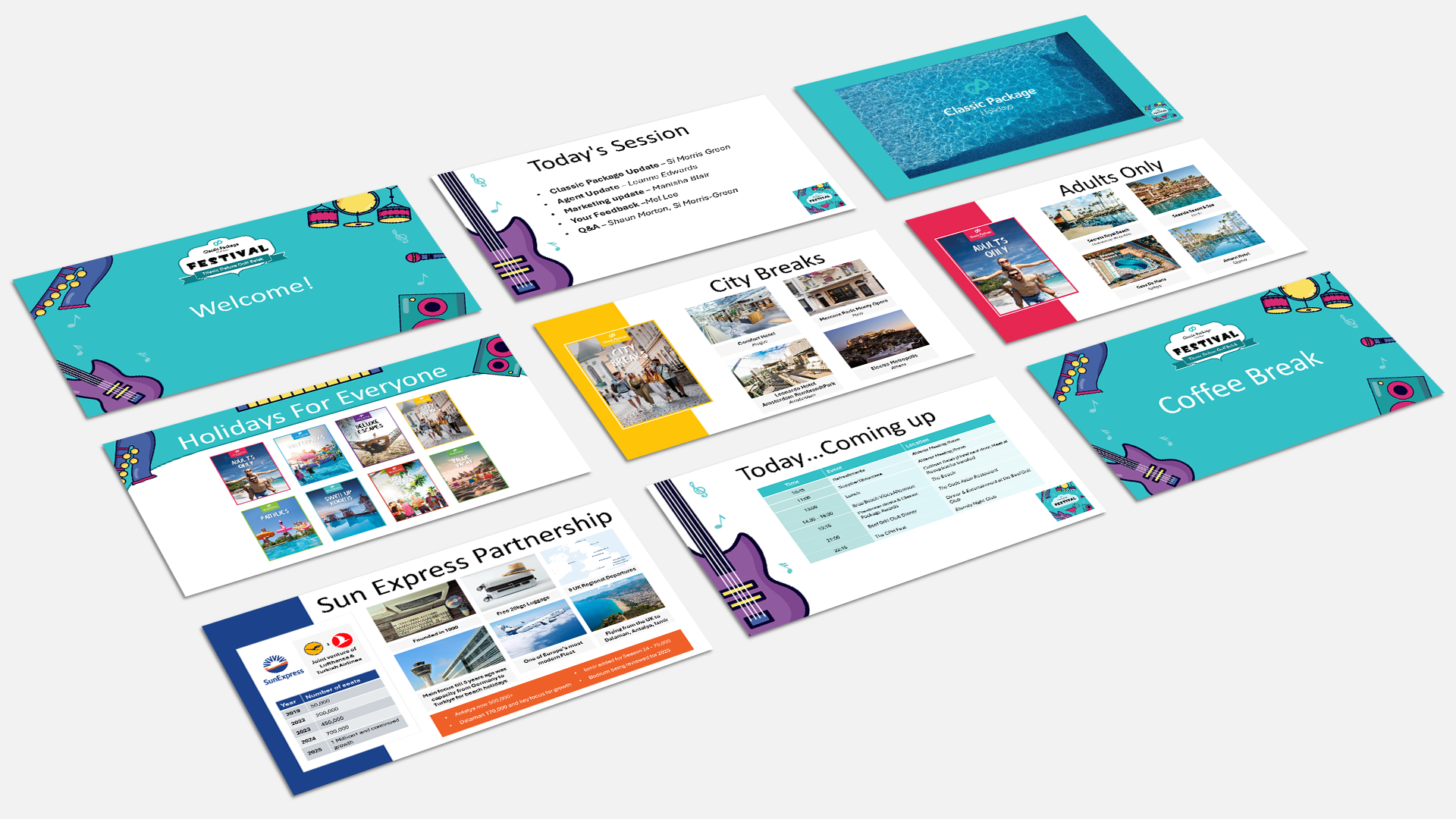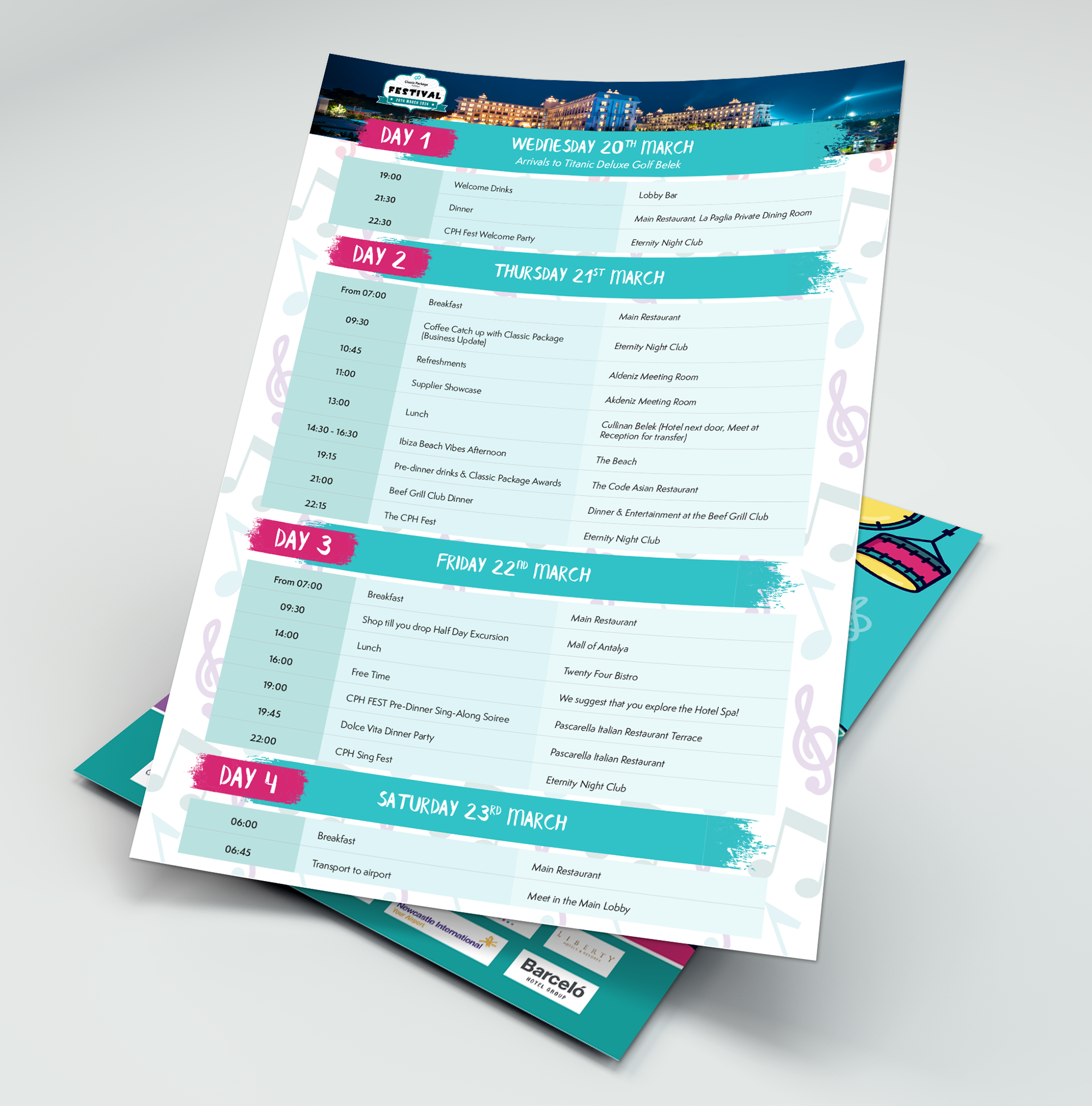 A four-day event hosted by a partner hotelier in Turkiye, the company invited the Top 100 selling travel agents to an exclusive awards gathering. Initial brief was to create a fun, colourful and consistent brand identity with a link to the multiple music acts playing at the event. Design assets created included logos, itineraries, pull-up banners, slide deck templates, lanyards, photo boards and name tags.