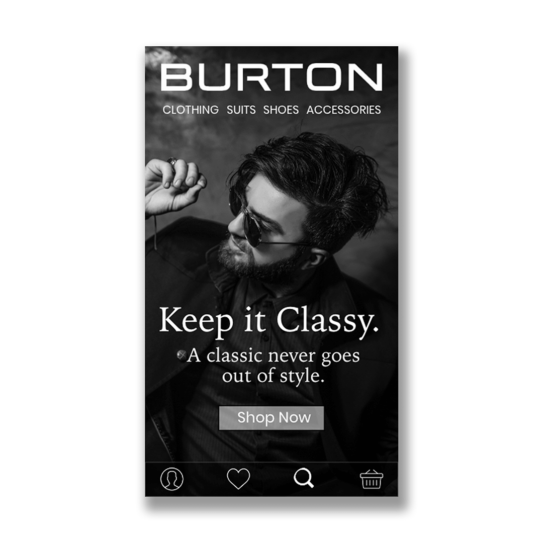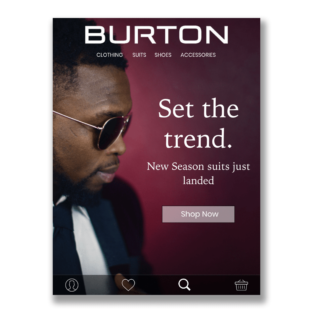 A UK Menswear brand required a set of 3 alternative landing pages designed to support upcoming marketing campaigns. Creatives needed to use their own words, maintain a clear navigation bar, ensure the designs were responsive to all device screen sizes and in line with the company brand guidelines.